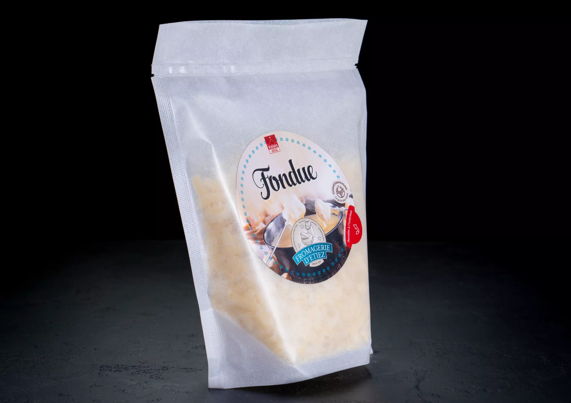 La Fondue d’Étiez - Label Valais est une création de notre fromagerie née de l’assemblage harmonieux de trois fromages emblématiques de notre production. Ce mélange d’excellence, authentiquement valaisan, offre une texture crémeuse, homogène et nappante. En bouche, le goût est riche et équilibré, entre douceur lactée et arômes plus corsés. Elle fond parfaitement, sans séparation du gras.